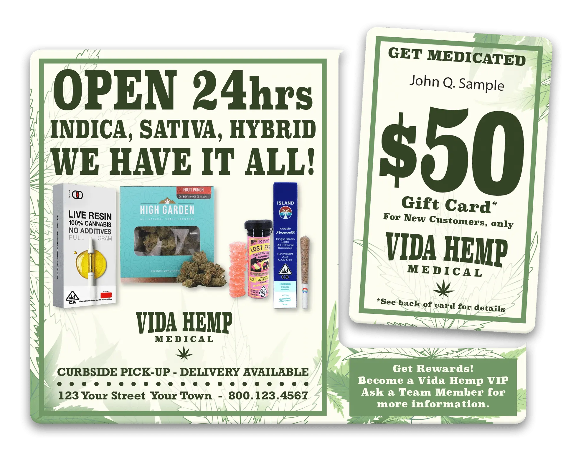 The cannabis market is highly competitive; you need to make a serious effort to get people to notice you, and then convert them into paying customers. Direct mail for cannabis is a powerful way to reach potential customers and drive engagement. We also know that driving repeat business is a critical part of your cannabis marketing efforts. It’s far more cost-effective to bring a customer back than to go out and get a new customer. Our pop-outs are also great as membership cards for loyalty campaigns.